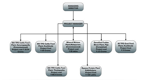 The Project Department of Kerala Feeds was created in June,2008 with a Manager as Special Officer and Head of the department . Till then the project activities were carried out by Manager Marketing as Special Officer Projects. This department is managed by a Manager with the assistance of consultants and employees on daily wages. They include technical staff and supporting staff at site office.